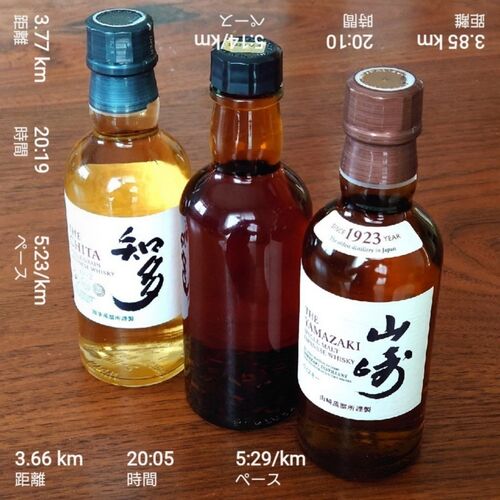 今日は20分走を3本で10km強走りました。 味変中の試作ウィスキーは、焦がし桜チップと共に知多の空き瓶へ移動し、色合いを比較してみました。6日目で山崎のような色に変化しました。色だけは美味そうなウィスキーです。 香りが気になり、栓を開けると桜チッ…
